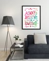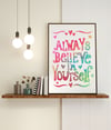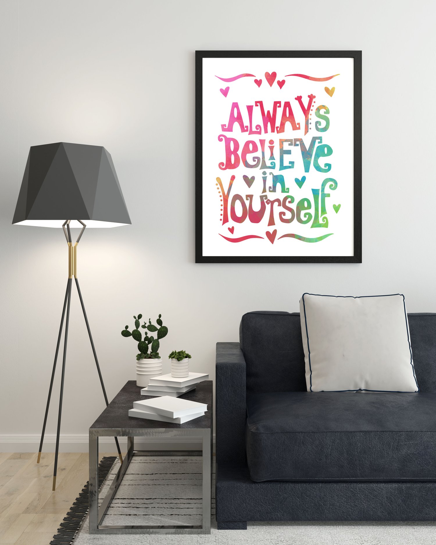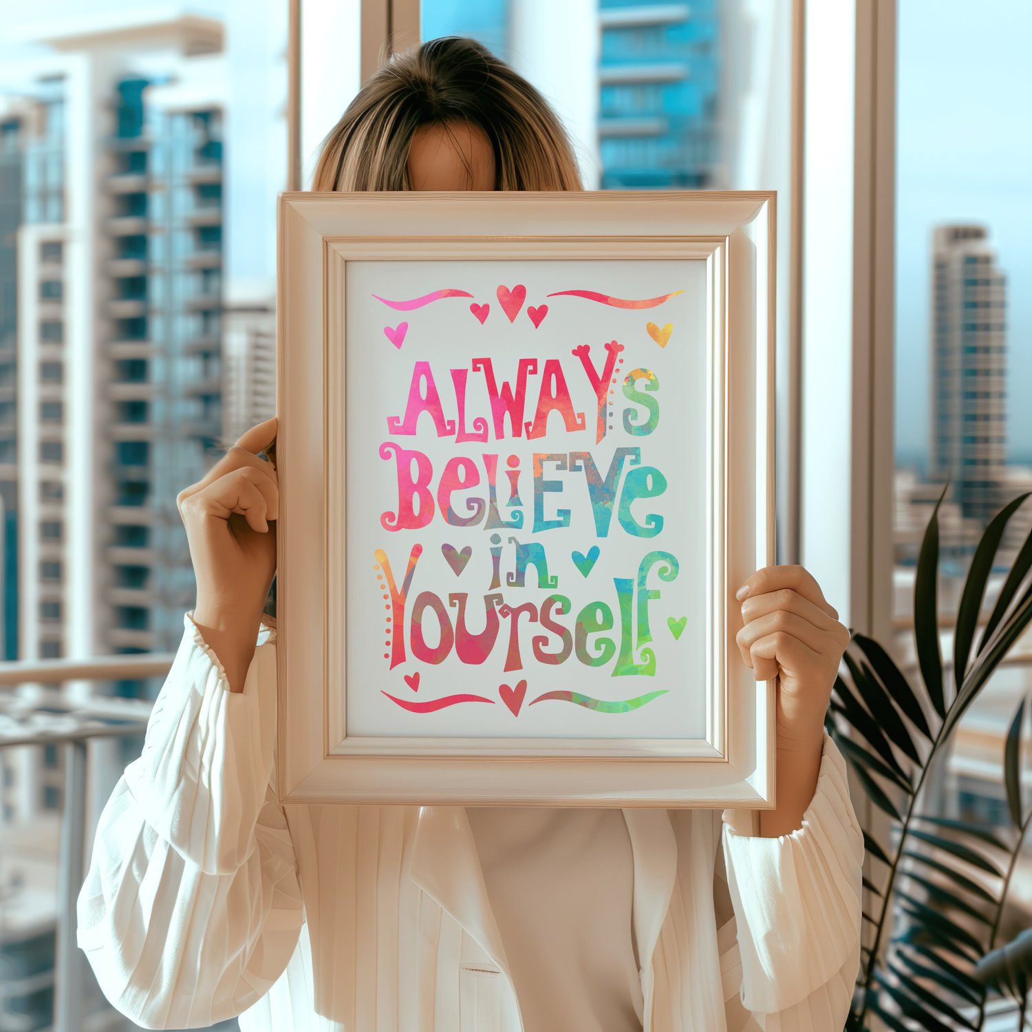 Infuse your space with positivity using this downloadable art print showcasing the inspiring phrase "Always Believe in Yourself" in a playful, hand-drawn style and a vibrant multicolour design. Ideal for brightening up your home, office, or classroom, this digital print adds an instant splash of colour and encouragement to your decor.