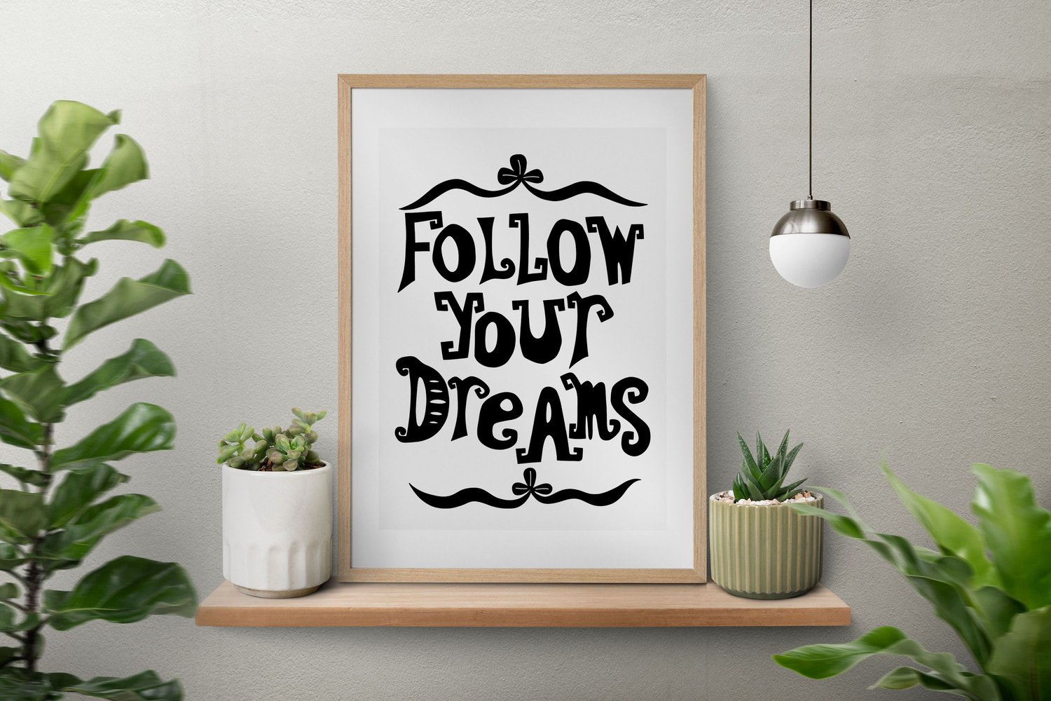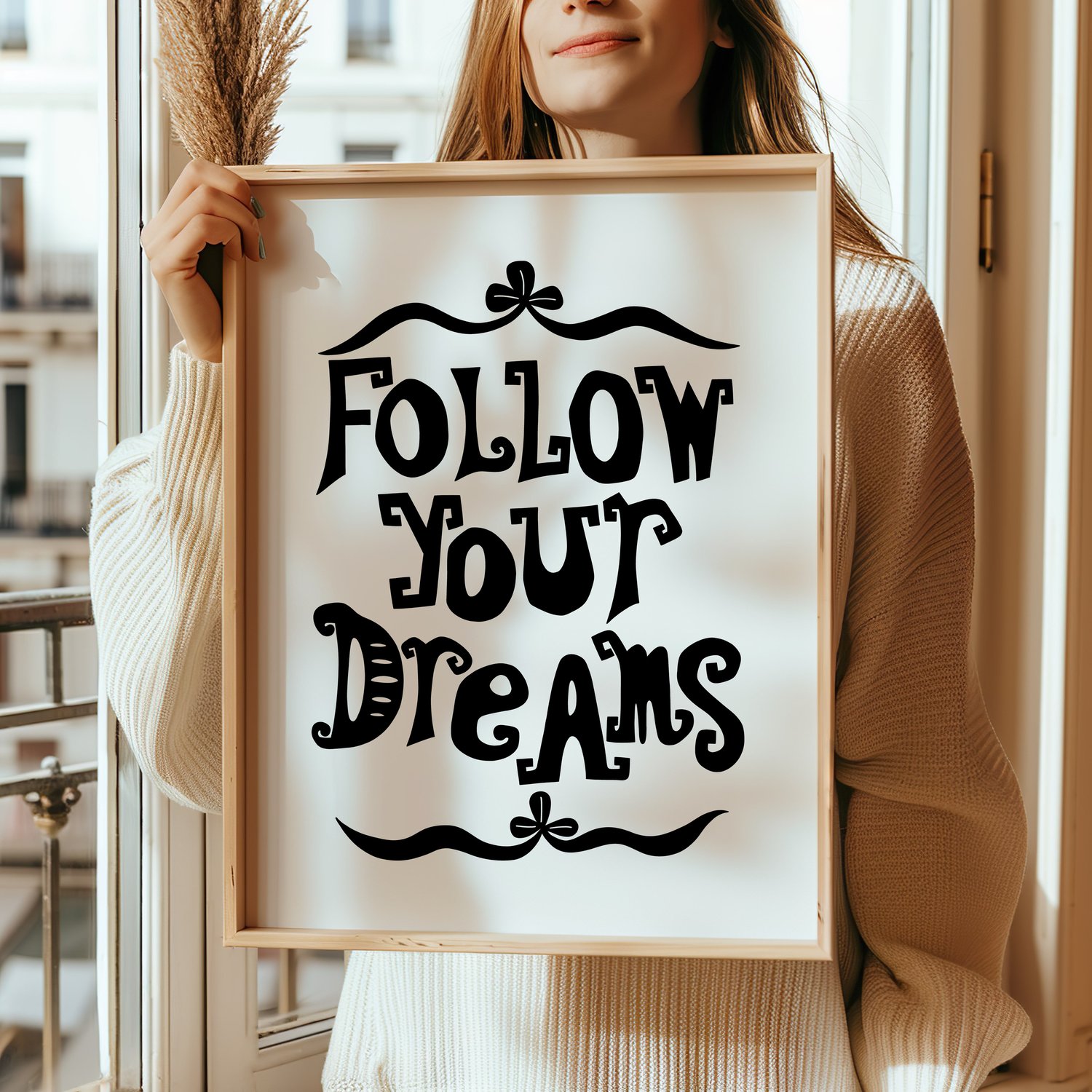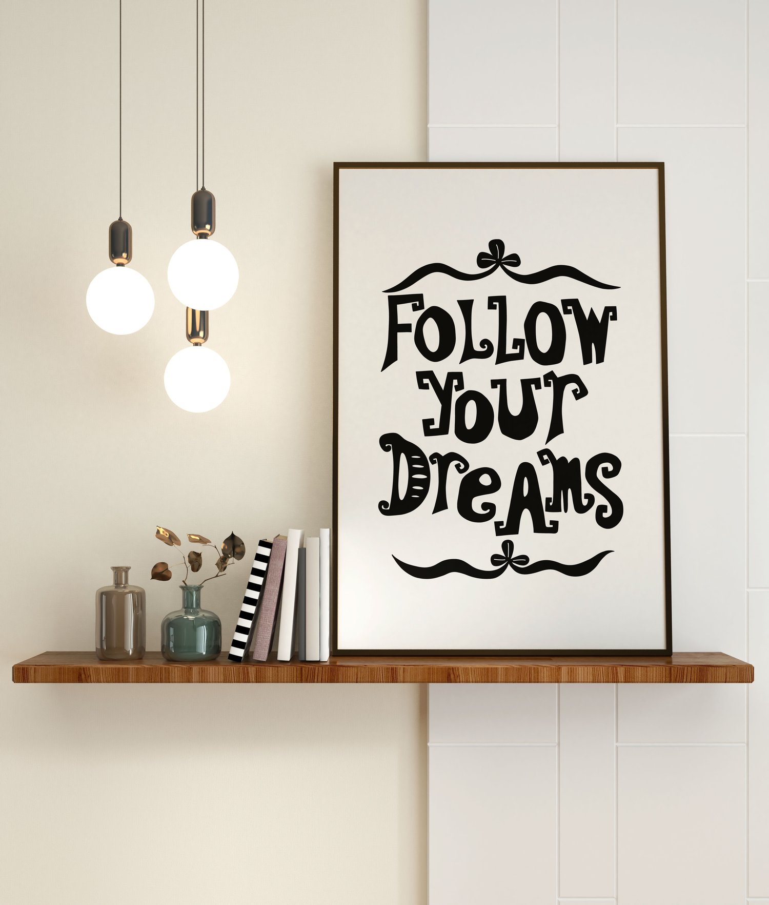 Inspire your space with this quirky, hand-lettered print featuring the uplifting phrase: "Follow Your Dreams."