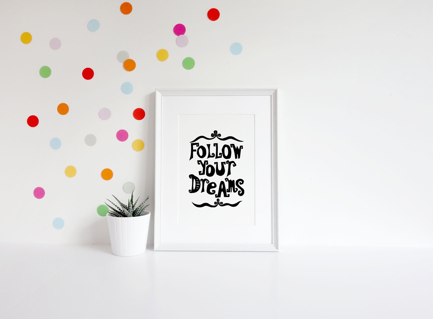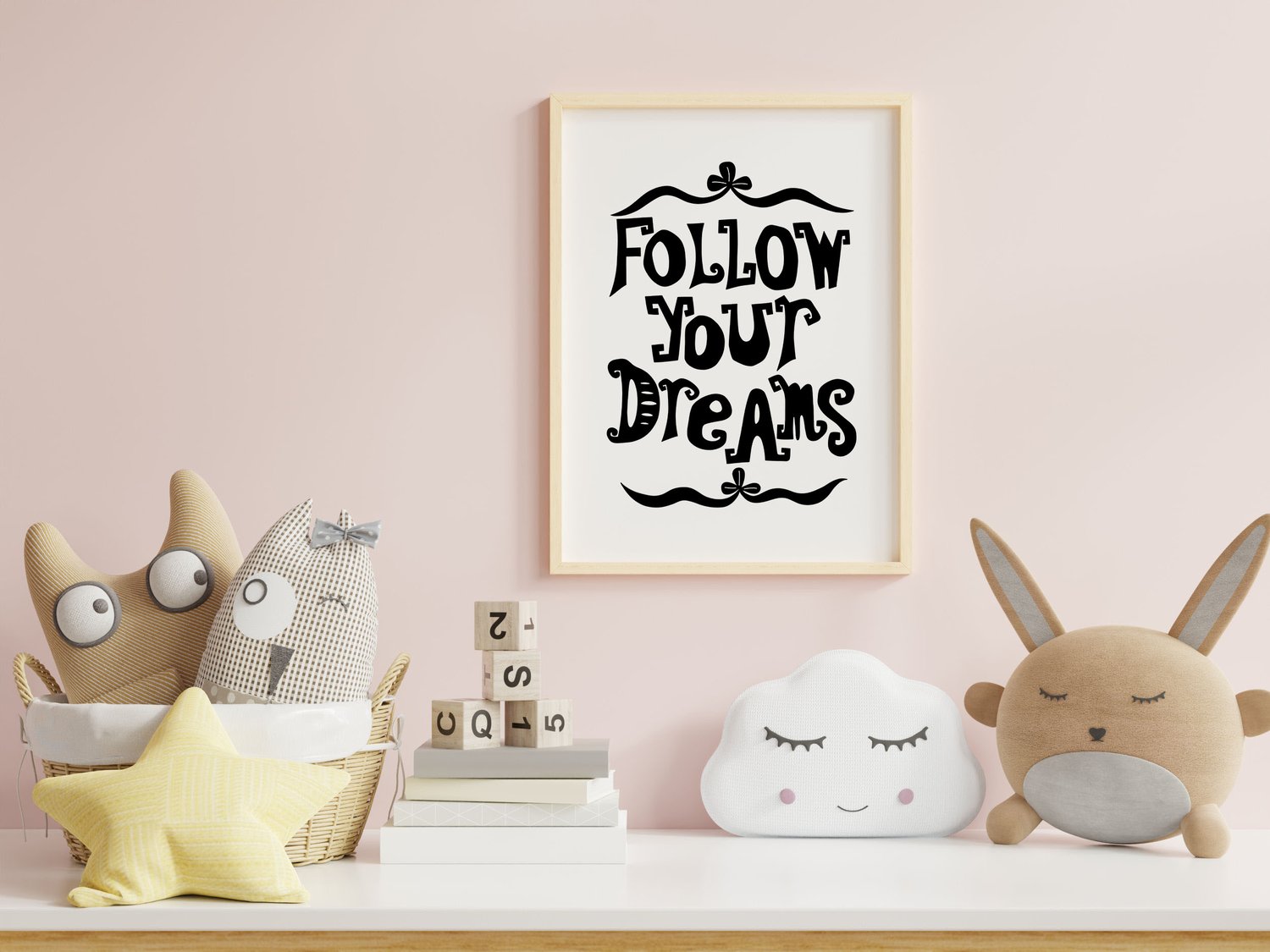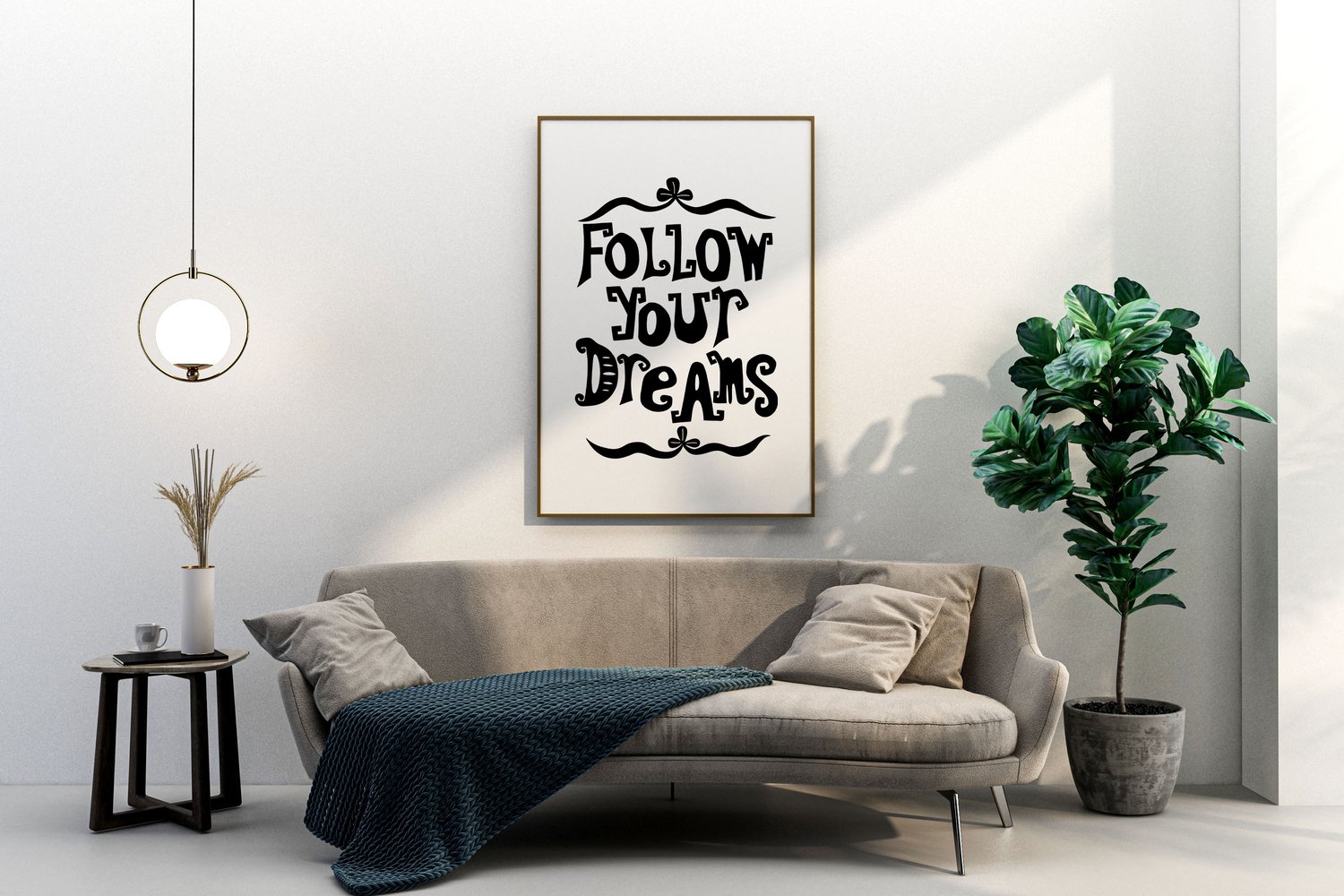 Inspire your space with this quirky, hand-lettered print featuring the uplifting phrase: "Follow Your Dreams."